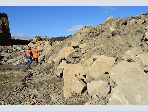 At Brinscall Quarry, Armstrongs’ team carefully dislodges large sections of pristine sandstone using specialist machinery, avoiding blasting methods to maintain the integrity of the material. Each piece is handled with care before being transported to the company’s stone workshop, where it is cut to reveal a cross-section for assessment.