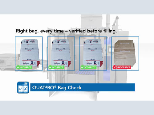 1) QUAT²RO® BAGcheck ends the problem of packing the right products into the wrong bag — a common mistake that leads to millions of dollars in credits. The system scans the empty bag to ensure it matches the product specifications defined by the operator. If the bag that is placed onto the spout is not correct, the packer will not begin the filling process.