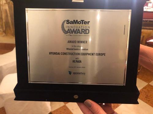 Hyundai Construction Equipment Europe (HCEE) scoops Samoter Technical Innovation Award, in the ‘Medium Wheel Loaders’ category, for the new HL960A wheel loader during the Samoter Innovation Award ceremony, held at the Hotel Due Torri in Verona on 23rd January.