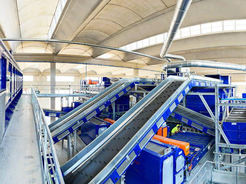 Materials in the 60 to 350mm range go through two STADLER STT5000_8 ballistic separators to sort out fines, 3D and 2D material. This is STADLER’s all-rounder, ideal for separating pre-sorted MSW, moderately heavy and heavy materials. STADLER’s new high-speed acceleration conveyor with the new STADLER film stabilizer transports the 3D and 2D materials to TOMRA near infrared (NIR) sorters at speeds of 4.5 m/s. Two of the sorters eject plastics with high chlorine values from the 2D stream, while the other two sort plastics for recovery from the 3D stream, and the remaining material goes to SRF. A TOMRA RDF analyses the SRF, checking in real-time the output material quality in terms of calorific values, humidity and product composition to ensure they meet the requirements for usage.