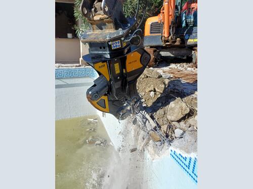 The pool is dismantled piece by piece, following the irregular geometry of the structure and adapting to varying concrete thicknesses. The real strength of the MB-P380 lies in its control: the operator can precisely modulate power, gripping and demolishing material without transmitting unnecessary vibrations to surrounding structures. A key advantage when working close to existing buildings or systems that must remain intact.