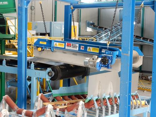 The incoming material was sized into two different fractions, a 3D and 2D fraction with a size range from 20mm to 200mm. Vimelco required an Overband Magnet installed inline over the head of the conveyors for the removal of general tramp iron. A Mastermag permanent in line overband (12PIL7) was selected for the 3D fraction to work at a 300mm gap across the 1000mm wide feed belt. Once cleaned of the ferrous contaminants, the material was to be transported to a 1000mm wide eddy current separator to have the non-ferrous metal fraction removed.