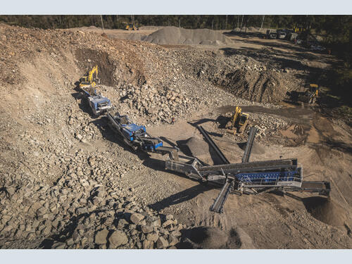 The plant train deployed here consists of a MOBICAT MC 110 EVO2 mobile jaw crusher, a MOBICONE MCO 90 EVO2 mobile cone crusher and a MOBISCREEN MSC 953 EVO mobile classifying screen. While the jaw crusher is used for pre-crushing, the task of the cone crusher in the second crushing stage is to reduce the feed material to manageable grain sizes and pass it on to the screening plant for appropriate classification. Thanks to this mobile solution, the plants can be relocated with minimal effort and are quickly back in production again.