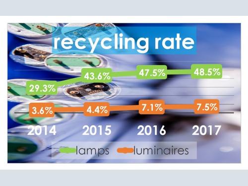 The luminaire recycling rate is inevitably lower than that for lamps as many are collected along with scrap metal.
