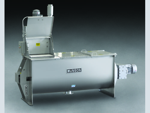 A new Munson Ribbon Blender, model HD-3.5-9-SS, features an integral bag dump station that collects dust generated during manual dumping activities, improving worker safety and plant hygiene.