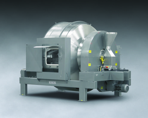 The rotating drum is supported by two oversized trunnion rings that ride on heavy-duty alloy roller assemblies, providing long life with minimal maintenance. The design eliminates the need for an internal shaft with seals contacting material. To contain dust, the machine has one seal at the inlet, which is mounted externally to allow rapid, inexpensive replacement, according to the company.