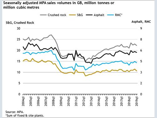 Following an unexpectedly strong performance at the end of 2018, sales volumes of mineral products across markets including aggregates, asphalt, ready-mixed concrete (RMC) and mortar declined in 2019Q1. Seasonally adjusted sales volumes for aggregates had the sharpest decline, down 4.2% compared to the previous quarter, followed by RMC (-4.0%), mortar (-2.8%) and asphalt (-1.9%).