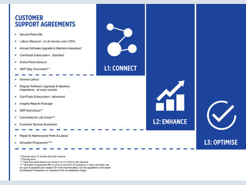 With effect from April 1st 2019 SMT GB has introduced three new Customer Support Agreements (CSAs), designed to further enhance the aftermarket support available to its customers. These new agreements have replaced the Blue, Silver and Gold agreements previously offered and include a much wider range of value added services.