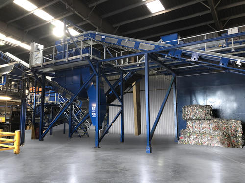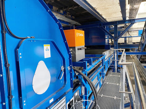 A dosing drum feeds the material, which goes through a pre-sort platform for the manual removal OCC (Old Corrugated Containers) and large film. A STADLER screening drum separates the remaining material into three fractions, Fines, Midsize and Oversize. The Oversize materials, above 170mm, go through a Quality Control cabin and Autosort optical sorter to remove mixed paper, cardboard and plastics and produce a PAMS (Newspapers, Periodicals and Magazines) fraction. The Midsize fraction, below 170mm, is separated into Fines, 2D and 3D fractions by the STADLER STT2000 ballistic separator. The 2D flat fraction is processed through Eddy Current Separators and Autosort optical sorter before a final Quality Control check to produce two streams, mixed paper fraction, and non-ferrous and ferrous fractions. The 3D rolling fractions follow a similar process, which begins with and Overband Magnet, to produce mixed plastic, HDP and PET fractions. Fines are being processed to remove contaminants to create a glass product. All the output fractions, with the exception of glass, are baled and sold.