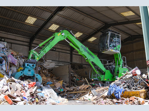 The yard at Stowmarket handles over 50,000tonnes of skip hire, construction, commercial and industrial waste each year, delivered to site through its fleet of skip lorries and ro-ro waste lorries. With such a high turnover of material the emphasis was on finding a compact waste handler that could work the concrete-slabbed yard efficiently. The Sennebogen 817E mobile material handler was the perfect fit.