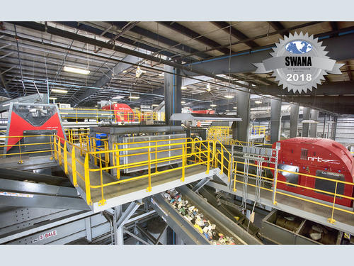 Penn Waste is receiving the award for its York, Pennsylvania, 45-tph single stream system retrofit. The 2017 retrofit, provided by Bulk Handling Systems (BHS), boosted capacity 130% to 45 tons per hour. It also added NRT optical sorting technology and a Max-AI AQC robotic sorter (Autonomous Quality Control) to improve container recovery and purity. The improvements resulted in a facility able to process 18,000 tons per month with more than 98% uptime and capturing 98% of recyclables. Penn Waste said that the company did not lose a single ton during the speedy retrofit and has since been running at 100% capacity with lower operating costs.