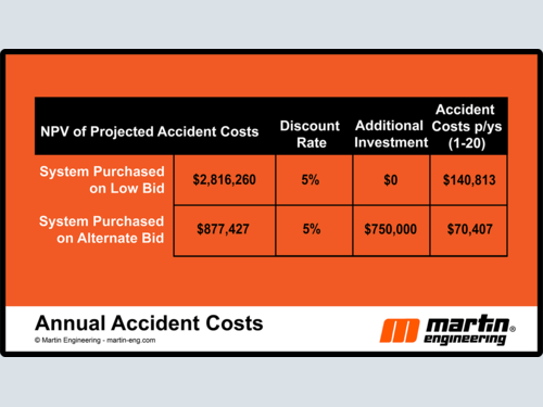 Assuming the life of the conveyor is 20 years and the cost of money (discount rate) is 5 percent, the available additional investment would be about $750,000 more in design time to accomplish the 50% improvement in safety. By choosing the lowest-priced bid to meet the minimum safety requirements, the short-term expenditure ends up costing considerably more over the 20-year lifecycle. [Figure 5]