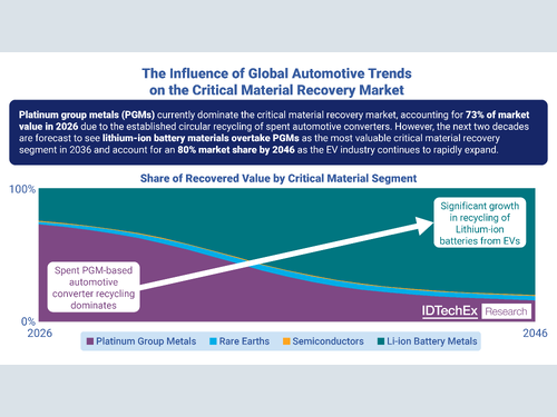 Recent global trade wars and geopolitical tensions have seen the imposition of a range of export controls on critical materials. These have resulted in significant disruptions to the supply chains of various critical materials, ranging from platinum group metals (PGMs, Pt, Pd, Rh and Ir) and lithium-ion batteries to rare-earth magnets and semiconductor components. The criticality of each of these materials stems from their global economic significance being undermined by supply risks resulting from the highly geographically localised nature of primary mineral deposits. Consequently, attention is increasingly turning towards critical material recovery from secondary (anthropogenic waste) sources to provide strategic insurance against future supply risksMoving forward, valuable lessons can be learned from the well-established market for the recovery of critical platinum group metals (PGMs), a notable success story which provides a blueprint for the wider critical material recovery market. IDTechEx’s recent report, “Critical Material Recovery 2026-2046: Technologies, Markets, Players” provides comprehensive market analysis, key players and granular 20-year critical material recovery market forecasts that are grounded in primary research. The report also includes deep-dives on the emergence of new extraction technologies and provides strategic insights into how these will shape the future evolution of the critical material recovery market.