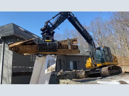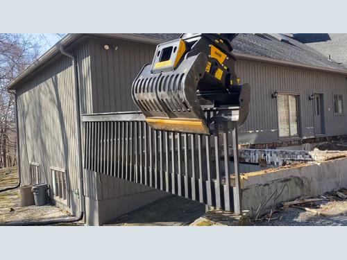 In upstate New York, a house collapsed due to heavy snofwall. The house’s roof could not couldn’t withstand the weight of the snow and when it collapsed, it destroyed the entire porch. What was left needed to be dismantled and then they had to rebuild the house. With a John Deere 180G and an MB-G1200 grapple, the company in charge of the job sorted the lumber and stacked it in one truck while creating a separate pile for all of the concrete. Then, they used an MB-S14 screening bucket to screen the rock and soil in order to have material ready to use to construct the new foundation.