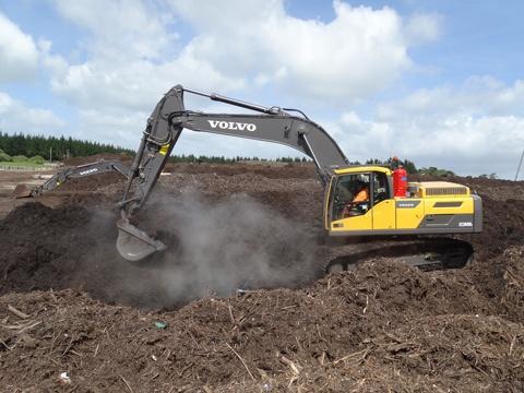 The EC300DL excavator has been fitted with 800mm tracks for enhanced stability and extra guarding to protect its undercarriage. The machine is in operation for up to 12 hours a day and extra working lights have been fitted to allow operations to continue regardless of the season. The machine offers a maximum breakout force of 205kN, an operating weight of up to 33t and a 2m3 bucket capacity.