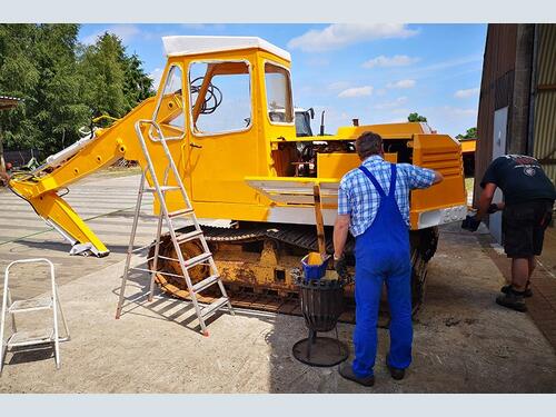 Together with his father and brother, he initially made the excavator technically fit for use again. The controls were converted to today's standard Euro controls, leaks in the hydraulics and diesel engine were repaired and the bodywork was restored over a period of months in their spare time. The biggest challenge was the badly worn components and the missing shims. But the robust, simple technology made many things possible