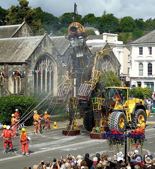 The Man Engine sports a number of ‘motifs’ of Cornish mining with a giant beam engine as a rocking neck, mining ‘head gear’ sheave wheels as shoulders, cast iron flangers and rivets throughout and hands that reflect massive 20th century excavators. A wheel loader, kindly provided by Volvo, acts as the Man Engine’s ‘puppeteer’, aiding the support crew of ‘miners’ who raise him up and animate him whilst he is ‘transformed.’