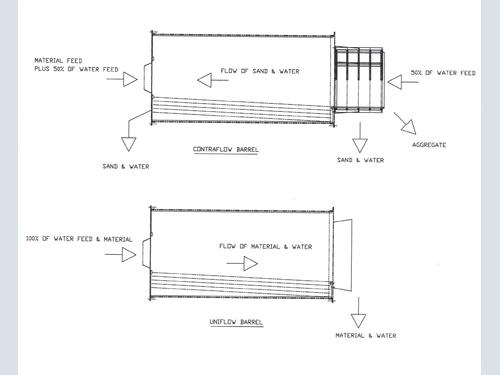 - Uniflow. This concept as the term suggests is where all the material that is fed into the machine comes out at the discharge end. On sand & gravel plants traditionally the material feed would have been removed of most of the minus 5mm sand thus allowing only the fines adhered to the stone to be scrubbed. All of the water used in this concept would enter at the feed end of the barrel and would travel in the same direction as the material.