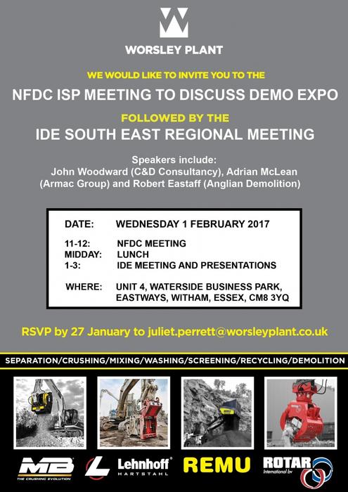 Preceded by an NDFC ISP Meeting in the morning, to discuss Demo Expo, the IDE meeting offers an interesting programme organised by Brian Carroll, Worsley Plant’s General Manager for the South. We will have three key speakers making presentations – John Woodward of C&D Consultancy, Adrian McLean of Armac Group and Robert Eastaff of Anglian Demolition.