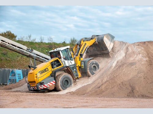 The heavyweight of the company’s XPower trio is the 33-tonne L 586, a front-line production machine fitted with 6m3 rehandling bucket. It works at Kelhead alongside a mobile crusher loading processed material into a dump truck which then transports the material for secondary processing, washing, or simply for export from the site.