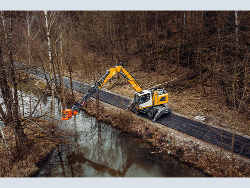 In order to reach trees and bushes that are far away Liebherr offers the new equipment combination of a Liebherr stick extension and Westtech Woodcracker® C250 with a lightweight cutting tool. In this combination the LH 22 M Industry, with the 2.25 m long stick extension, has a reach of up to 13.8 m and an operating weight of around 24,100 kg. Complemented by the optional LIKUFIX® quick coupler this equipment version enables a quick change between tools and attachments such as a milling machine, mulcher or trench clearing bucket for clearing channels after pruning.