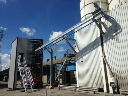 Due, mainly to site constraints, the additional loading facility had to be fed from clients existing silos. The final design catered for an additional outlet from client’s silo and via a flow control valve & large diameter screw the product is then fed back down the site via c 15m airslide to a new out loading structure. Loading is via SN Engineering's latest incarnation of its ever popular SN7000 series of loading bellows, the SN7001.
