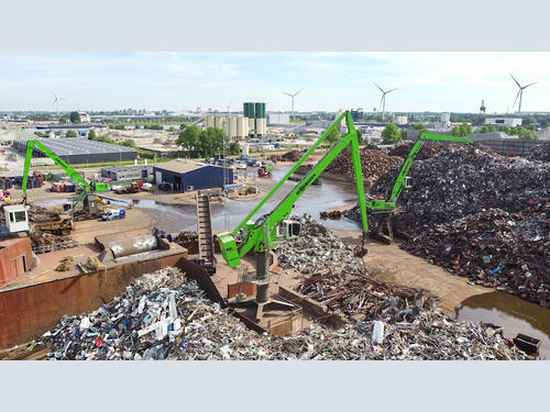 To efficiently handle these enormous quantities, EMR in Amsterdam relies on a powerful fleet of machines. Two SENNEBOGEN 875 E machines carry out the central material handling in Amsterdam. They handle everything from ships to unloading arriving trucks to loading the shears. The port material handlers impress with their handling capacity of up to 850 tons of metal per hour each, while maintaining low energy consumption. Thanks to the Green Hybrid recuperation system, operating costs can be reduced by up to 50%.