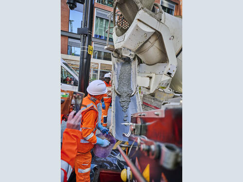 The trial pours took place in April 2025 on a full-scale test slab beneath the new theatre venue in CWG’s Wood Wharf, followed by pours in September 2025 creating two-metre-deep raft slabs on its Bank Street site.
