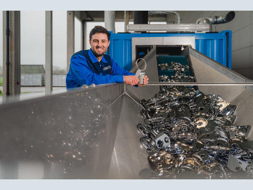 It was 2019 when Zapf, in the course of his master’s studies, finally became aware of ImpulsTec’s shockwave technology, which promised recovery of both material fractions with a high level of purity. From 2021 to the beginning of 2023, the two companies worked together to develop a procedure for stripping the galvanised plastic components. To do this, they combined the shockwave treatment with pre-shredding as well as subsequent magnetic separation. The facility has now been in operation at the Hansgrohe production site in Offenburg/Elgersweier since the start of 2024.