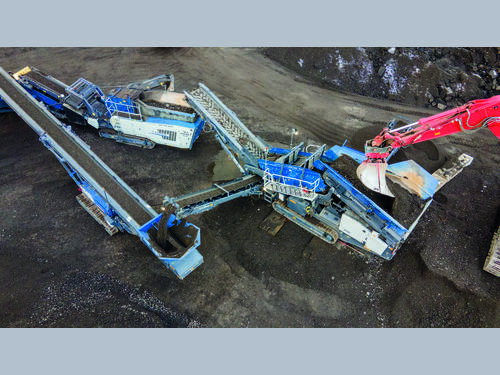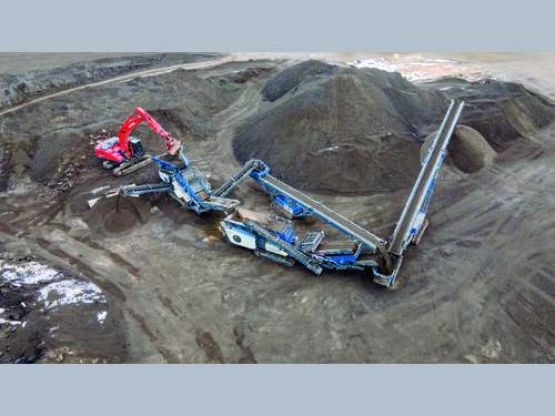The united power of a MOBISCREEN MSS 502 EVO scalper, a MOBIREX MR 100 NEO impact crusher and two MOBIBELT stackers...
