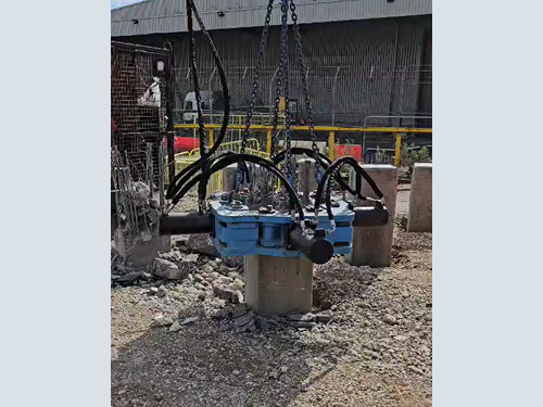 The NPC pile cropper works with a hydraulic connection between the excavator and the pile cropper via quick release fittings on excavators (generally ranging from 13t to 30t). The excavator lifts the pile cropper over the pile and addresses the first pile cut at 300mm from the top of the concrete pile with the cropper being powered via the excavator. The four blades of the cropper then connect with the pile in sync enabling cutting of the pile and then removal of manageable sections.
