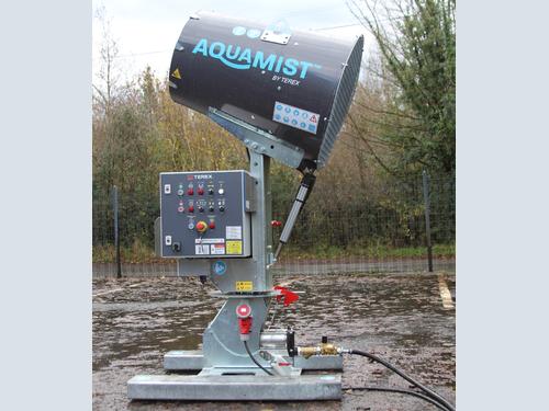 The ‘Aquamist by Terex’ dust suppression system offers an improvement over conventional jets or water-sprays to manage the build-up of dust and better protect workers on jobsites by using a high-capacity misting fan that produces finely divided water droplets in the size range 10-150 micron diameter. At this size, they easily combine themselves with dust particles of similar dimensions and precipitate them out of the air and, because water-mists “float” more than a conventional spray, they cover and envelop the dust cloud more effectively.