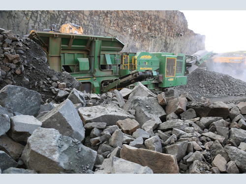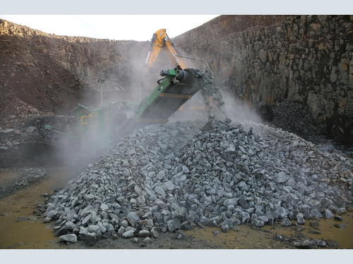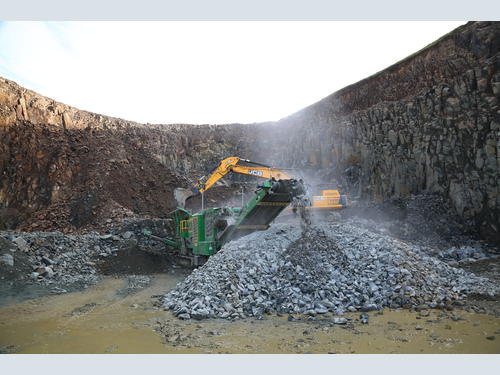“Here in quarry, after we blast, we bring the crusher in and feed it from the ground, right off the blast face. It’s very dense, good quality stuff, some of the hardest stone in the area.”