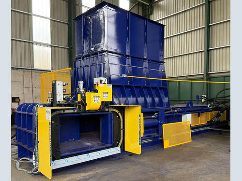 This 2013 used Harris / IPS two ram baler (TR-1288-100S-LID-LS) has a 165-tonne press force and a 75-kW main drive motor capable of processing up to 16 tonnes per hour.